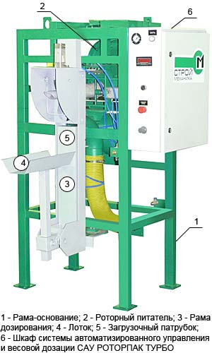 Станция фасовки клапанных мешков РОТОРПАК ТУРБО серии «СтройПак» производства машиностроительного предприятия «СтройМеханика» предназначена для фасовки сыпучих, порошкообразных и зернистых продуктов таких, как сухие строительные смеси, цемент, песок, известь, шлак и другие материалы в клапанные мешки весом от 10 до 50 и более килограмм со скоростью до 350 упаковок в час. Станция фасовки выполнена по зарекомендовавшей себя с положительной стороны "классической" роторно-пневматической схеме.